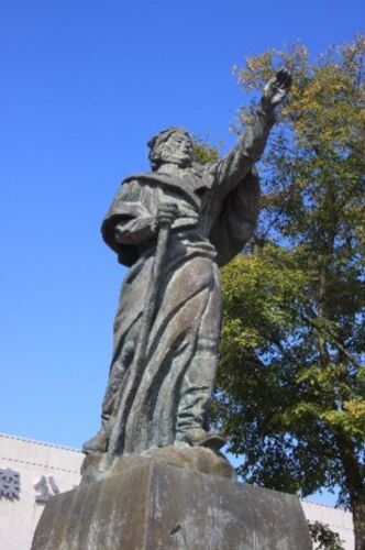 青森市の郊外に立つ青森公立大学。玄関前のテラスに立つのは、アダム・ミキェヴィッチ像。 (2008年10月撮影) 大学の説明によれば 「自由へと旅する詩人の像」と名づけられているこの像は、本学の開学にあたり、ここに学び研鑚を積む清新なる若者に、大いな…